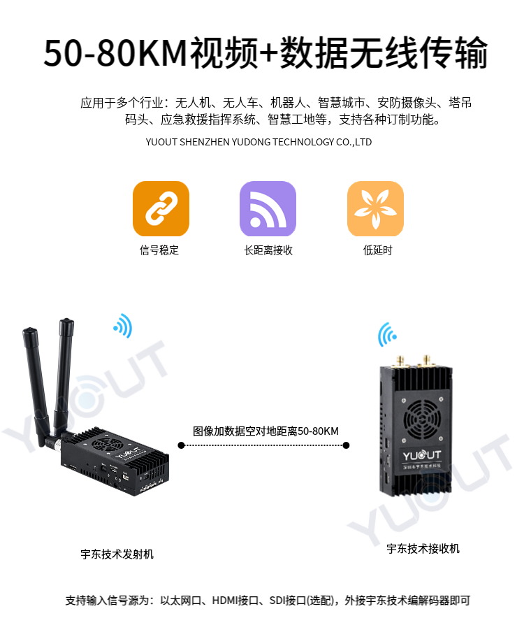 YD-TS0080-WK  是應(yīng)用于無(wú)人機(jī)行業(yè)的圖數(shù)控一體化超遠(yuǎn)距離無(wú)線傳輸設(shè)備(最遠(yuǎn)可達(dá) 50至80 公里),具有體積小、功耗低、通信距離遠(yuǎn)等特點(diǎn),支持高清視頻、飛控?cái)?shù)據(jù)、云臺(tái)控制數(shù)據(jù)、遙控器控制數(shù)據(jù)等同時(shí)傳輸。
